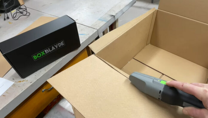 BoxBlayde ist ein akkubetriebener Kartonschneider, der speziell dafür gemacht wurde, Pappkartons schnell und sauber zu zerkleinern.