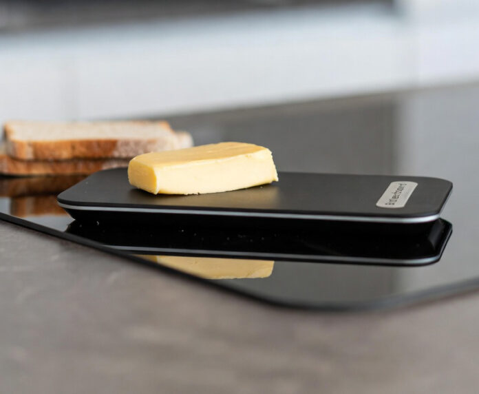 Ein patentiertes Brett, das durch gespeicherte Umgebungstemperatur harte Kühlschrank-Butter innerhalb einer Minute streichzart macht. Kein Strom, keine Zusatzstoffe, kein Aufwärmen nötig.