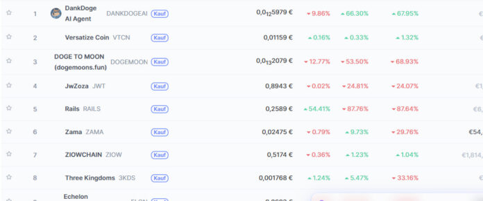 1. DankDoge AI Agent (DANKDOGEAI) mit einer Marktkapitalisierung von rund 252.000 Euro und einem Wochenplus von fast 68 Prozent gehört zu den auffälligsten Newcomern. Der Coin kombiniert das bekannte Doge-Meme mit KI-Funktionen.