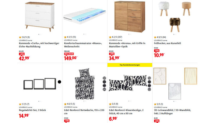 Im Vergleich zu IKEA oder anderen Möbelhäusern liegen die Preise ähnlich niedrig, die Auswahl ist aber nicht ganz so riesig. Dafür kannst du bei Livarno oft auf Aktionspreise setzen und musst nicht extra ins Möbelhaus fahren – online bestellen und liefern lassen reicht.