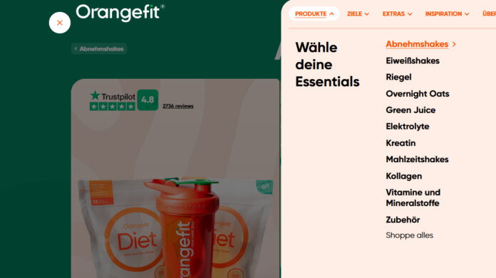 Orangefit hat ein komplettes Sortiment an pflanzlichen Ernährungsprodukten: Der beliebte Diet-Shake zum gesunden Abnehmen, hochwertige Eiweißshakes, praktische Riegel für unterwegs, nahrhafte Overnight Oats, erfrischender Green Juice, Elektrolyte für die Regeneration, Kreatin für den Muskelaufbau, sättigende Mahlzeitshakes, Kollagen für Haut und Gelenke sowie Vitamine und Mineralstoffe. Alle Produkte sind 100% pflanzlich, vegan und ohne künstliche Süßstoffe., und so sieht das aus BILD.