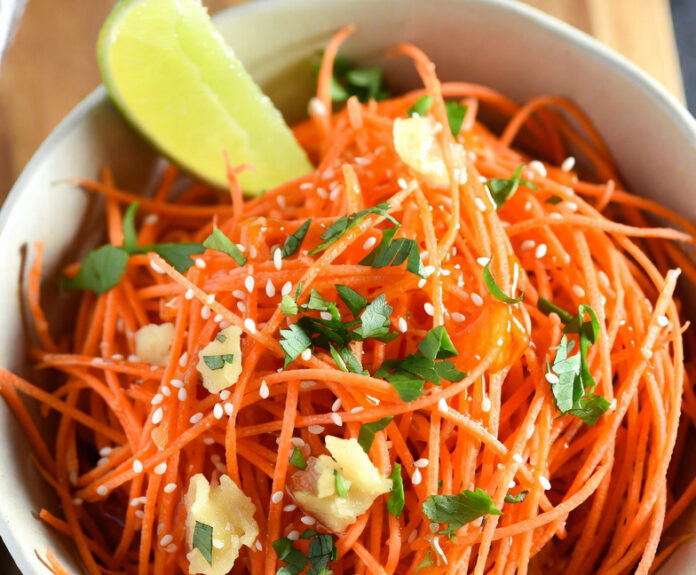 Die meisten Rezepte für Möhrensalat mit Honig setzen auf die klassische Kombination aus Apfel, Zitrone und etwas Öl. Das funktioniert, ist aber nichts Besonderes. Hier kommt frischer Ingwer ins Spiel, dazu Limettensaft statt Zitrone und ein Schuss Dijon-Senf, der das Dressing cremiger und runder macht.