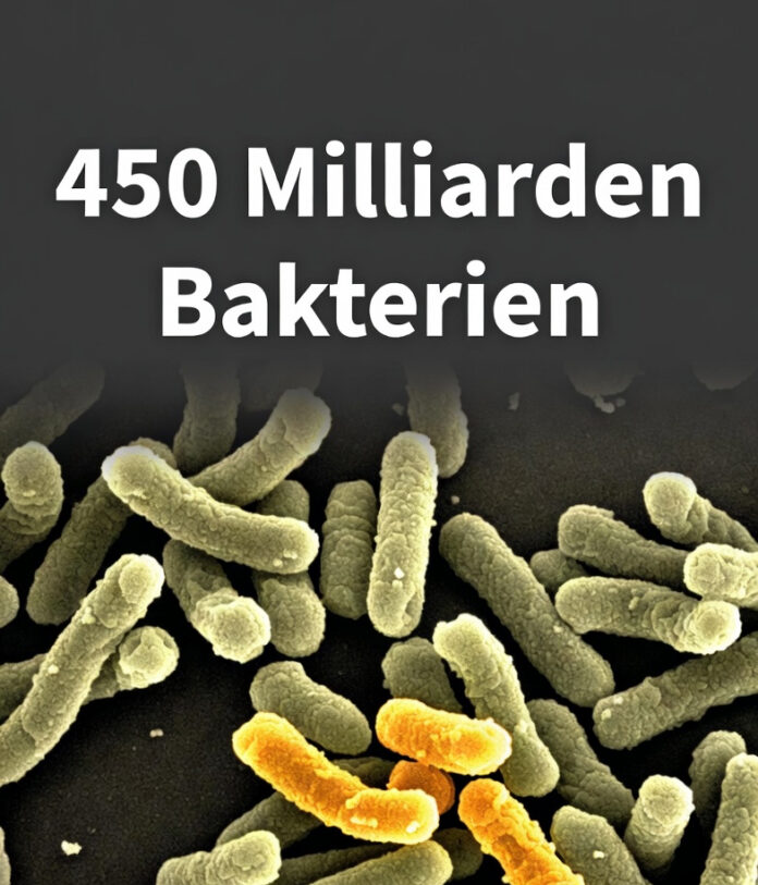 Ein einziger Beutel enthält 450 Milliarden koloniebildende Einheiten (KBE) aus 8 verschiedenen Bakterienstämmen. Zum Vergleich: Die meisten handelsüblichen Probiotika liefern zwischen 1 und 15 Milliarden Bakterien pro Portion.